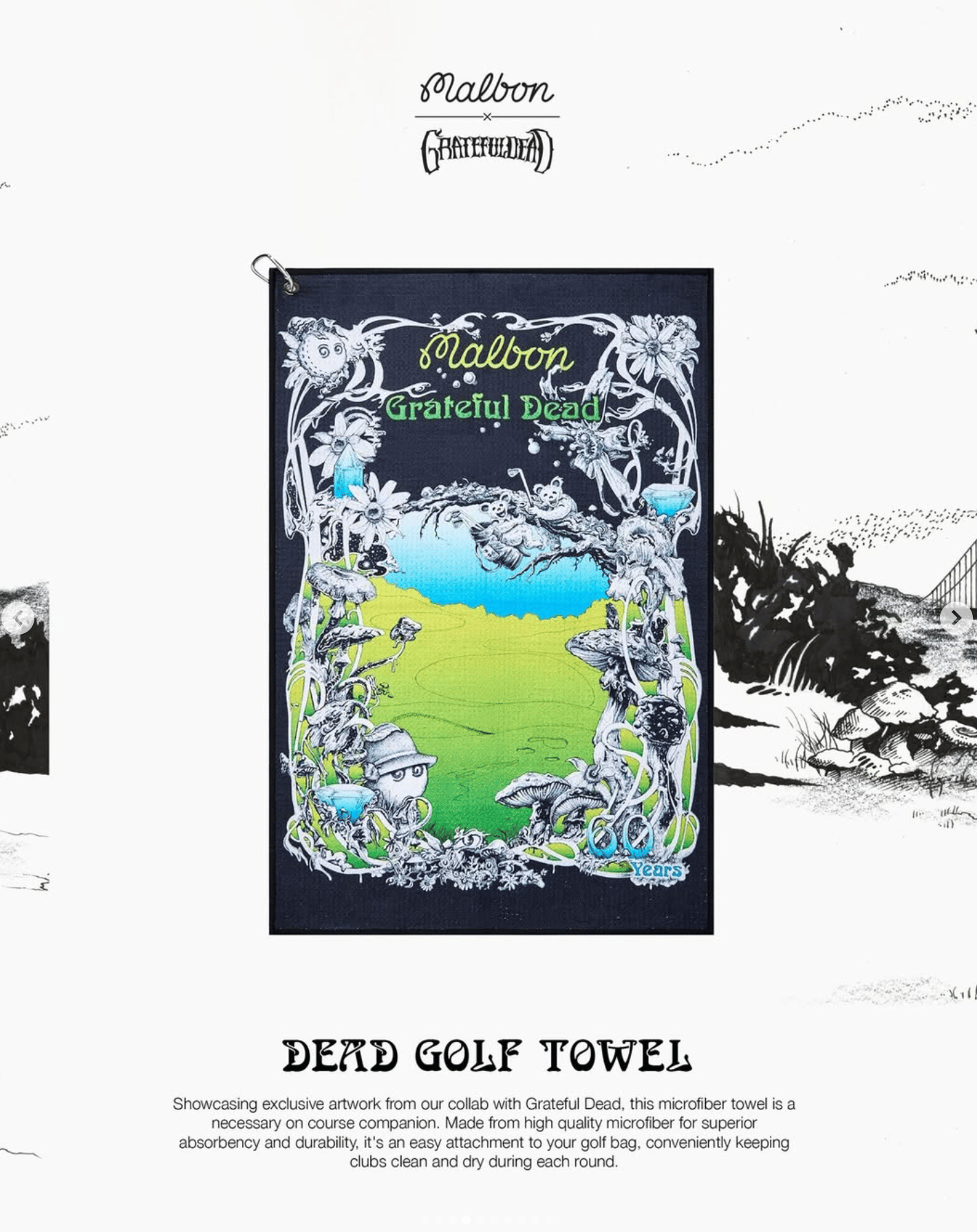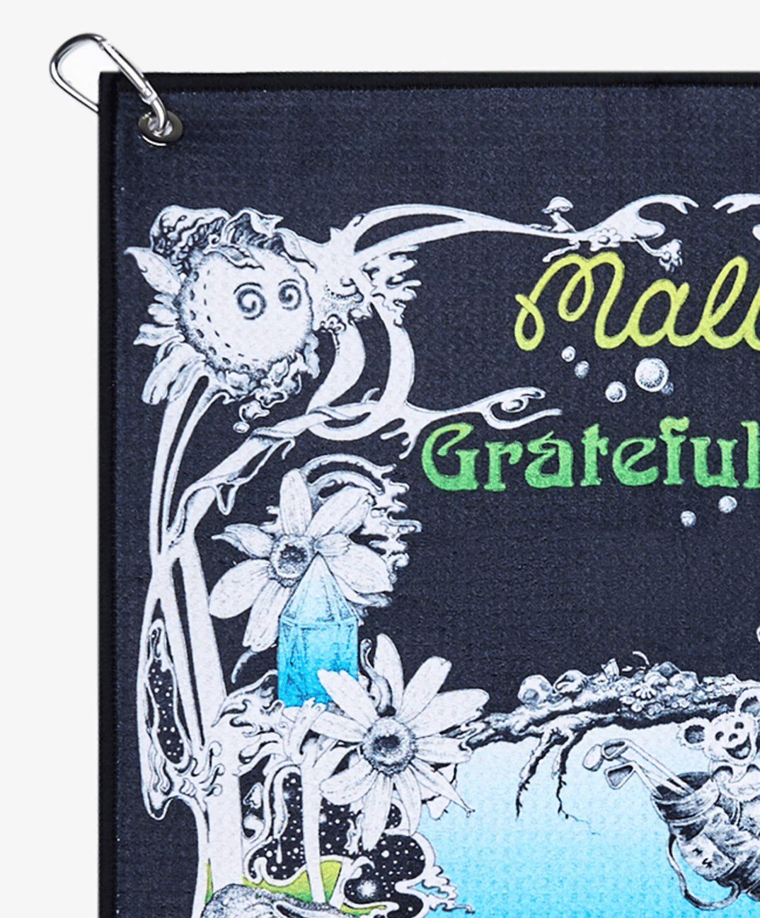 Showcasing exclusive artwork from Malbon collab with Grateful Dead, this microfiber towel is a necessary on course companion. Made from high quality microfiber for superior absorbency and durability, it's an easy attachment to your golf bag, conveniently keeping clubs clean and dry during each round.